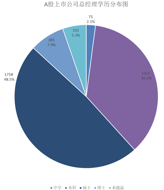 据悉,3625家上市公司的总经理中,获得硕士学位的最多,占比48.5%,本科次之,占比36.2%。但也有192家上市公司未披露学历资料。